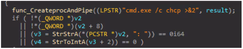 We also found chcp command execution and passage of the result to a created pipe. The result of this command line may give the locale country region of the compromised host base on its result. For example, the 437 result means “default code page in the US”.