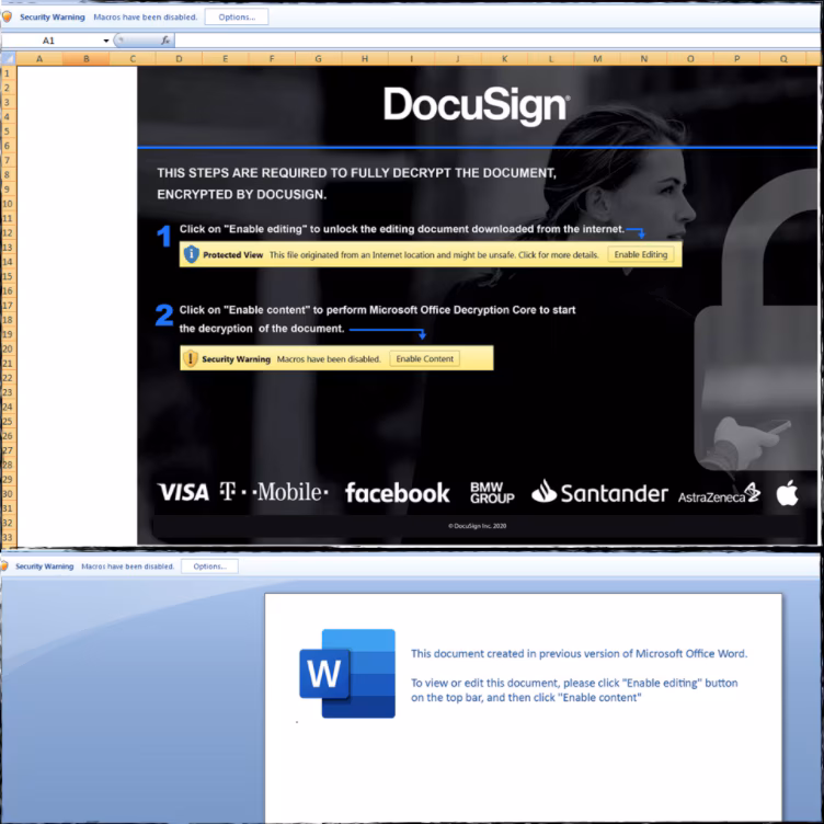 Below is the screenshot of the phishing campaign (Word and Excel) that will download the IcedID downloader as soon as the user runs the malicious macro document in the targeted host.
