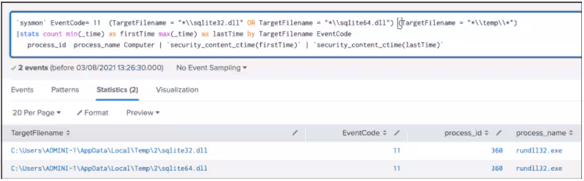 |stats count min(_time) as firstTime max(_time) as lastTime by TargetFilename EventCode process_id process_name Computer | `security_content_ctime(firstTime)` | `security_content_ctime(lastTime)`