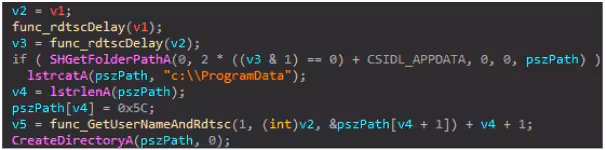 The next code snippet below shows the .dll in memory locating the .png payload in a randomly generated directory based on the user name of the compromised machine created in either %appdata% or “C:\Programdata”. If the .png file payload is found in either of those two folder paths, it will decrypt the shellcode from the image file if not it tries to download from the C&C server.