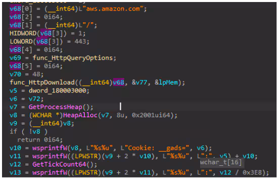 The initial IceID loader binary will decrypt another .dll file in memory to download the 2nd stage payload (png or .dat) files. This is done by initially connecting to aws.amazon.com to check the internet connection and to prepare its initial C2 communication.