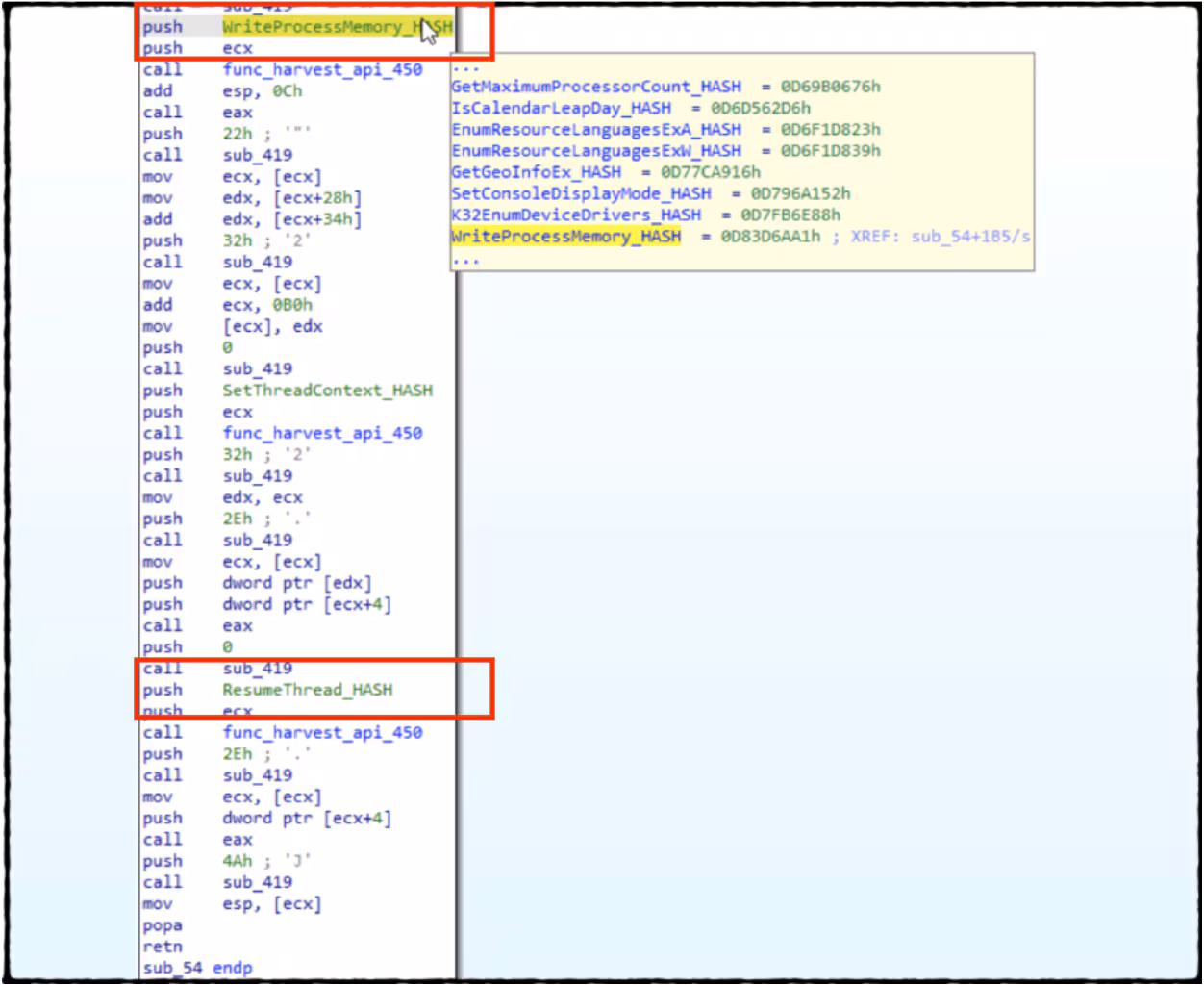 The decoded shellcode uses pre-computed API hashes to dynamically resolve its API import in order to inject the Remcos malware into a targeted process on the host. The screenshot below shows the last WriteProcessMemory API and the ResumeThread API calls get used to write and subsequently execute the Remcos RAT in the target process where it injects its code.