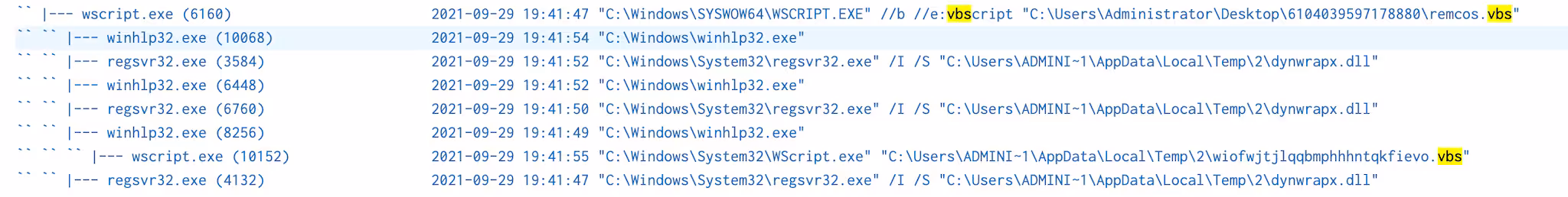 To execute the shellcode for Remcos via process injection, it first decodes and drops “dynwrapx.dll” in the %temp% folder and loads/installs it using Regsvr32 install silent parameter (“regsvr32 /I /S”). This DLL will give the VBScript access to the “DynamicWrapperX'' Object to load 2 more windows DLL modules named user32.dll and kernel32.dll to allocate memory and execute the shellcode.