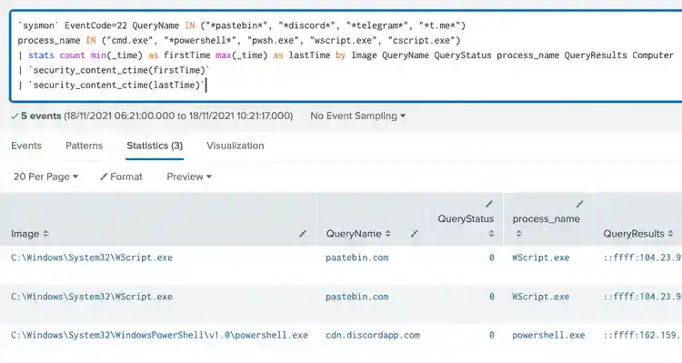 | stats count min(_time) as firstTime max(_time) as lastTime by Image QueryName QueryStatus process_name QueryResults Computer