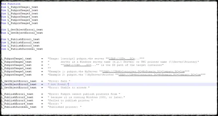 STRT found the script loader interesting in how it tries to evade inspection by preventative controls by embedding a large amount of normal script code and comments at the beginning and end of the loader. For example, the screenshot below shows its code in lines 120-150 pertains to Microsoft “pubprn.vbs”, a script designed to publish printers within active directory domain services. Skimming over the code quickly gives it away that shellcode is embedded inside.