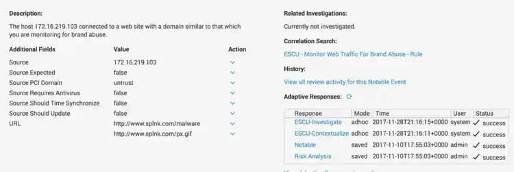 Splunk will create notable events when it detects a suspicious brand permutation. You’ll get the URL, source, IP address with likely geographic information, contextual searches to help you scope the problem, and investigative searches.