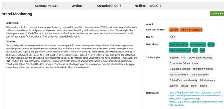 Once configured, the ESCU app can leverage our adaptation of DNSTwist to generate a list of possible permutations of specified brand names and/or faux domains. Then Splunk continually scans email sender addresses, web traffic, and DNS requests to provide you with notable events that might match these brands of interest. A drilldown will provide you with even more actionable information, such as IP addresses, URLs, and user data.