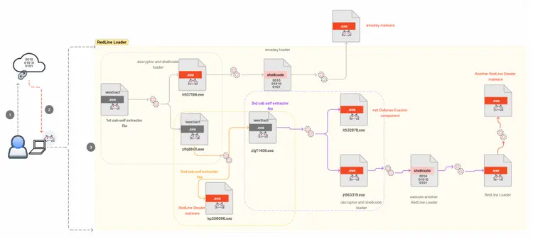 Figure 3 shows a simple flow diagram of how RedLine Stealer uses a loader in the form of a self-extracting archive (.exe) to initiate its infection. This loader then executes two more self-extracting archive executables that are responsible for decrypting a shellcode to load the Amadey Trojan and two instances of the RedLine Stealer malware onto the system. Additionally, the loader also executes a .NET executable that is responsible for defense evasion.