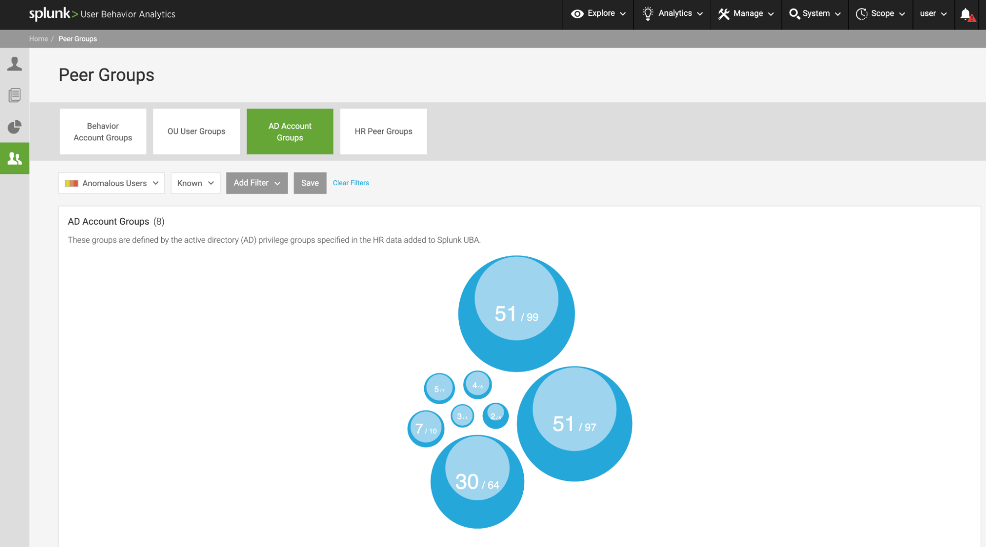 In Splunk UBA, machine learning models leverage peer groups and entity profiling, as shown in Figure 6. There are four main types of peer groups: Human Resources peer groups, which include Active Directory (AD) groups and management chains; Organizational Unit (OU) groups, which are based on organizational units; Behavioral groups, which cluster behavioral patterns; and Device peer groups, defined by network activity of device groups. Entity profiling encompasses both user and device profiling, achieved through the analysis of user and device properties derived from AD activity.