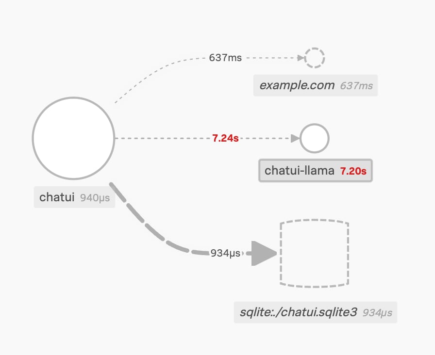 As an example of the visibility that you can get, here’s our example organization’s chat platform running on a normal day. The frontend talks to the database backend and also to the Large Language Model service, providing responses as needed.