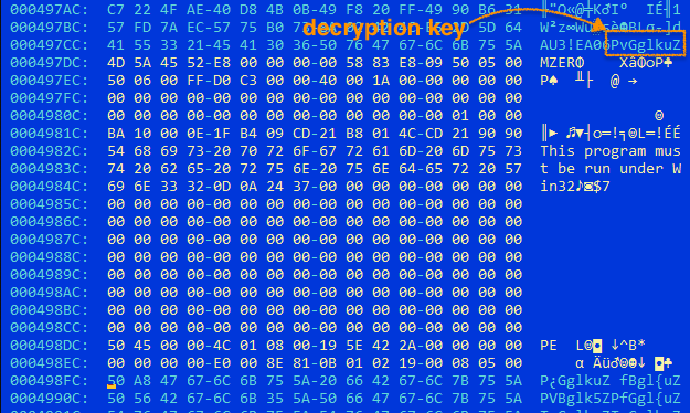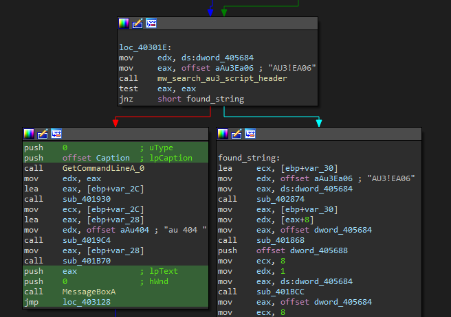 The embedded win32 PE file, triggered by the shellcode execution, will read the compiled AutoIt script script.au3. Its primary objective is to search for a specific string recognized as the AutoIt script compiled bytes header, denoted by 'AU3!EA06.' This string search operation holds significance, as it aims to pinpoint an essential 8-byte decryption key instrumental in decrypting the DarkGate malware. The 8-byte decryption key is placed right after the 'AU3!EA06' string.