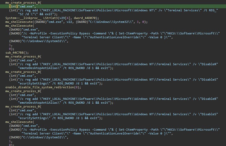 DarkGate also manipulates multiple registry settings related to Remote Desktop Protocol (RDP) configurations on the compromised host. These alterations grant DarkGate control over the system through this protocol, allowing the malware to potentially modify RDP settings to suit its operational needs or facilitate remote access and control.