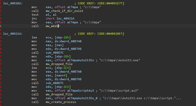 The first decoded file resulting from the base64 process is a valid Autoit3.exe, employed to execute the second file: a compiled AutoIt script named script.au3. Both files are dropped within the 'c:\tmpa' directory and executed through the straightforward commandline directive.