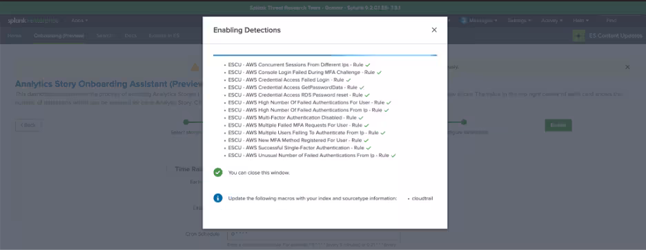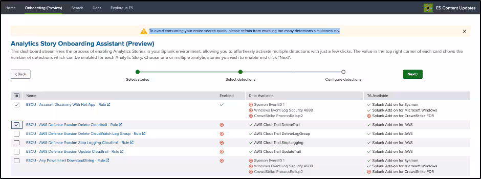 This new feature helps accelerate how you enable detections in your SOC. With just a few clicks, the onboarding wizard guides you through the process of enabling all relevant detections for the selected analytic story. This means faster setup times and a more efficient way to bolster your defense strategies.