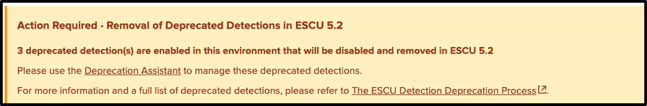 We show the following warning banner on the ESCU landing page in all Splunk environments that have enabled and running deprecated detections with the only exception of users of Enterprise Security 8.0.0 who have enabled content versioning.