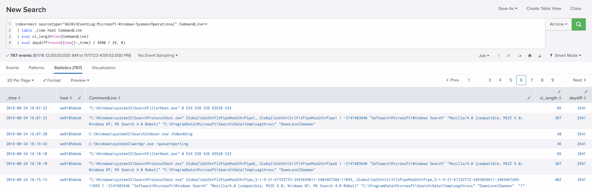 Another way eval can be used for hunting is by calculating the time elapsed between different events and applying functions to date/time values. Continuing with my earlier hypothesis and applying the sort command, I can see that I have a long command line string on a specific host and I want to calculate how many days have passed since that command line string of interest executed on the system.