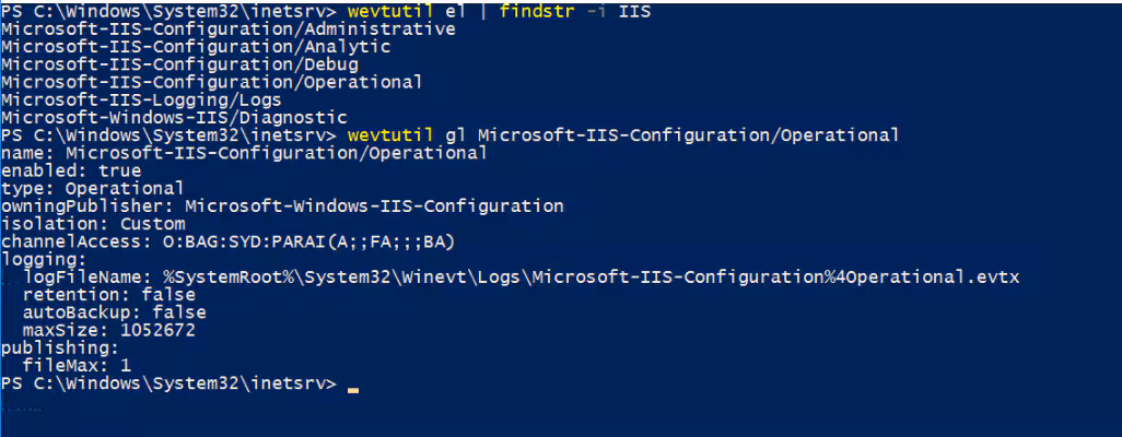- Configuration for the selected log: `wevtutil gl Microsoft-IIS-Configuration/Operational`
