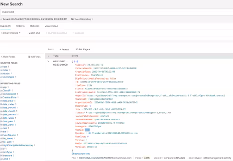 In the example below, we have data from Office 365 OneDrive where the events show an employee opening a file. We would like to mask the employee ID accessing the file and send this redacted event to another index.