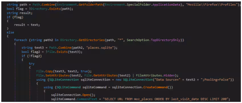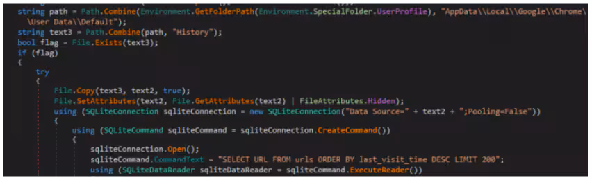 It also has some functions that parse the browser information like history and URL visits of users in both Chrome and Firefox applications. This is done by accessing the SQLite database of those browsers and executing SQL queries to its database.