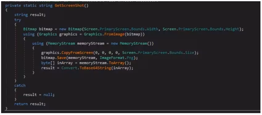 Another feature identified is taking a screenshot of the compromised host. The screenshot image will not be dropped on the disk; rather, it will be saved in a memory stream that will be encoded to base64 and sent to its C2 server.