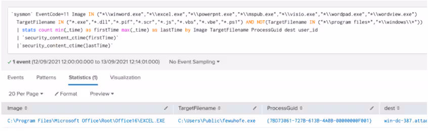 | stats count min(_time) as firstTime max(_time) as lastTime by Image TargetFilename ProcessGuid dest user_id