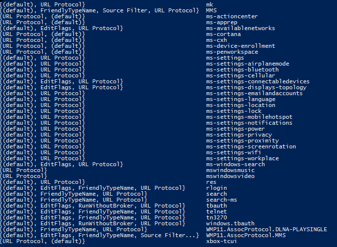 After querying for all protocol handlers constrained to “URL Protocol” on Server 2016 and Windows 11, and deduplicating the two sets, a lookup was created based on it. It’s also possible to do the inverse and create the lookup based on all handlers, but it will be noisy and there is more.
