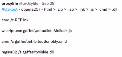 This QakBot sample can execute the dropped .DLL copy of itself or a .DLL plugin downloaded from its Command and Control (C2) server using several techniques available in Windows Operating System such as Living on The Land Application (LOLBIN) or through scripts.