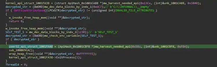 - It checks if the file “C:\INTERNAL\__empty” exists. This file can be used to check the existence of Windows Defender emulation. If this file exists it will right away return 0 that will exit its code execution.