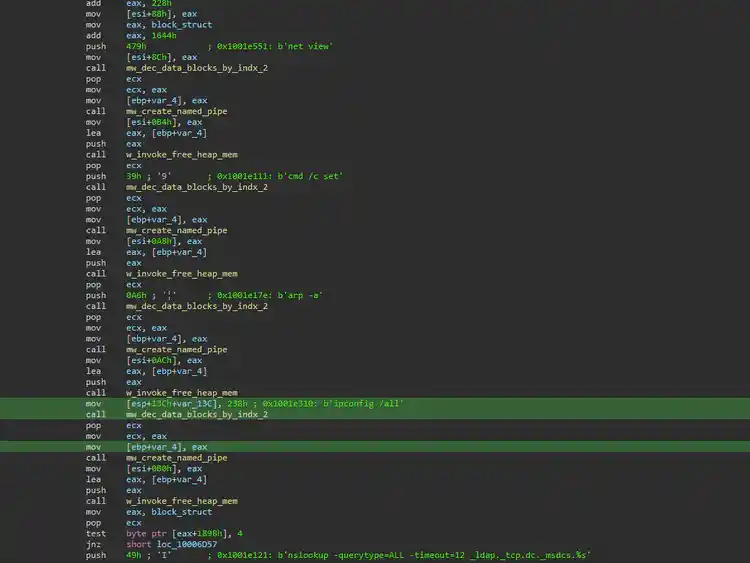 Figure 6 is a screenshot of QakBot code that will execute several Windows commands to collect system and network information that will be sent to the remote C2 server.