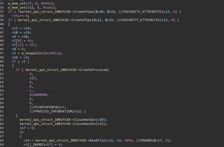 This malware also uses a named pipe to communicate to its other process running on the compromised host. Figure 18 is a code snippet showing how it creates named pipes and reads data or files sent or transferred on that randomly generated named pipe.