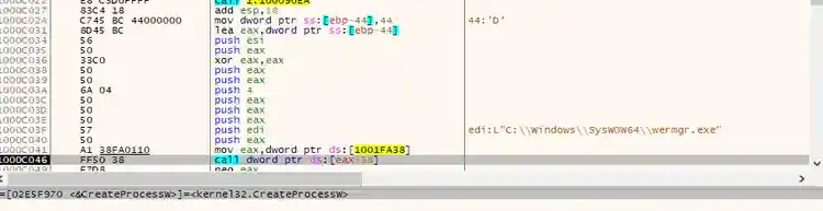 Figure 13 shows the code and how it creates a suspended process (the wermgr.exe) as the first step of the process hollowing technique.