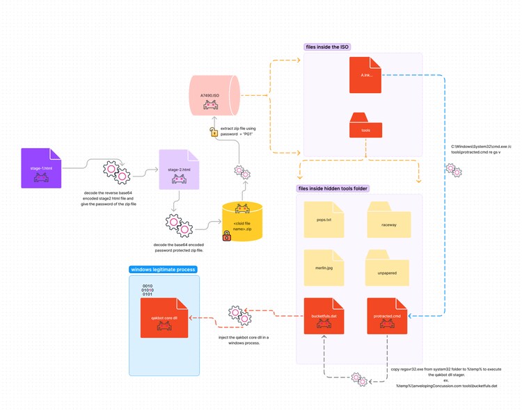 - ISO file contained within Zip, including LNK and QakBot loader