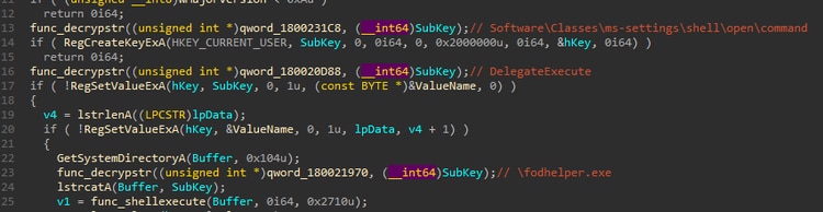 One example is bypassing User Account Control to elevate process privileges or execute elevated COM objects without prompting the user through the UAC notification message box. Figure 4 is a code snippet of how Remcos RAT attempts to disable the UAC through the registry by checking and disabling the EnableLUA value.