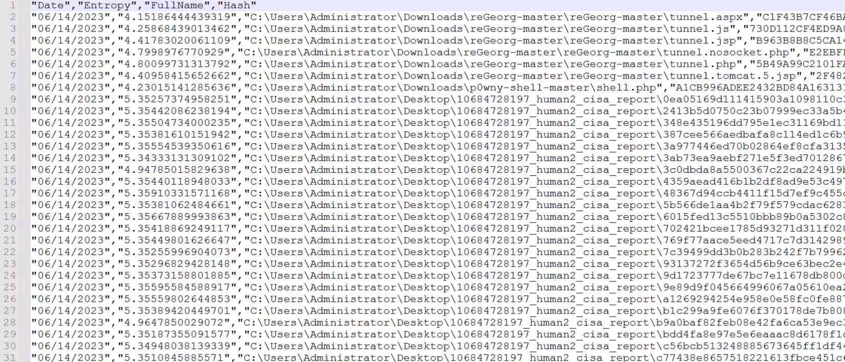 ShellCSV assists with identifying the entropy of good files on disk. The idea is that defenders can run this on web servers to gather all files and entropy values to better understand what srcs and extensions are most prominent in their working environment.