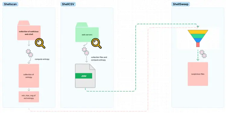 Working together, the ShellScan, ShellCSV, and ShellSweep utilities offer the ability to scan multiple directories at once, filter known good files by SHA256 or src, scan specific file extensions, and evaluate the potential maliciousness of these files based on their entropy.