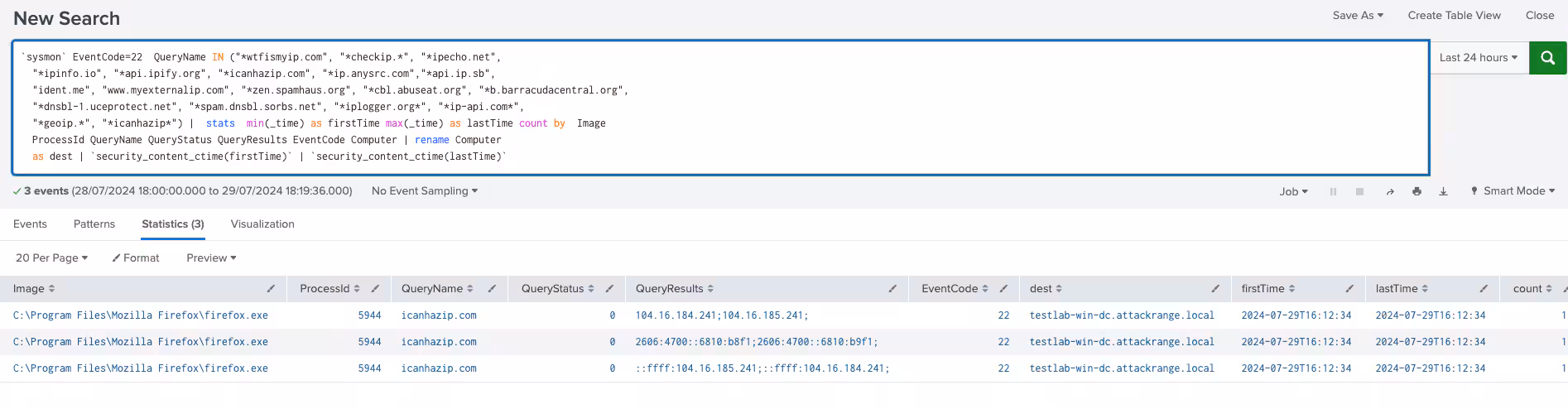"*geoip.*", "*icanhazip*") | stats min(_time) as firstTime max(_time) as lastTime count by Image