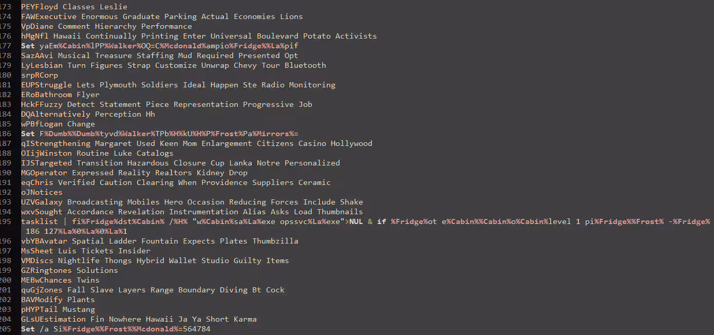 The "Carroll" file mentioned above employs a simple yet clever obfuscation technique for Windows Command Shell scripts, making them challenging to analyze at first glance. This method scatters garbage or invalid Windows commands among legitimate batch script instructions. Despite the presence of these invalid commands, the Windows Operating System can still execute the underlying valid script. This approach effectively masks the true functionality of the script while allowing it to run as intended, creating a layer of complexity for analysts attempting to understand its purpose.