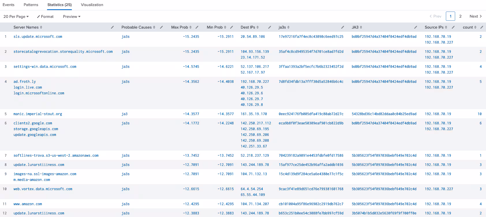 | table "Server Names", "Probable Causes", "Max Prob", "Min Prob", "Dest IPs", ja3s, "JA3", "Source IPs", count