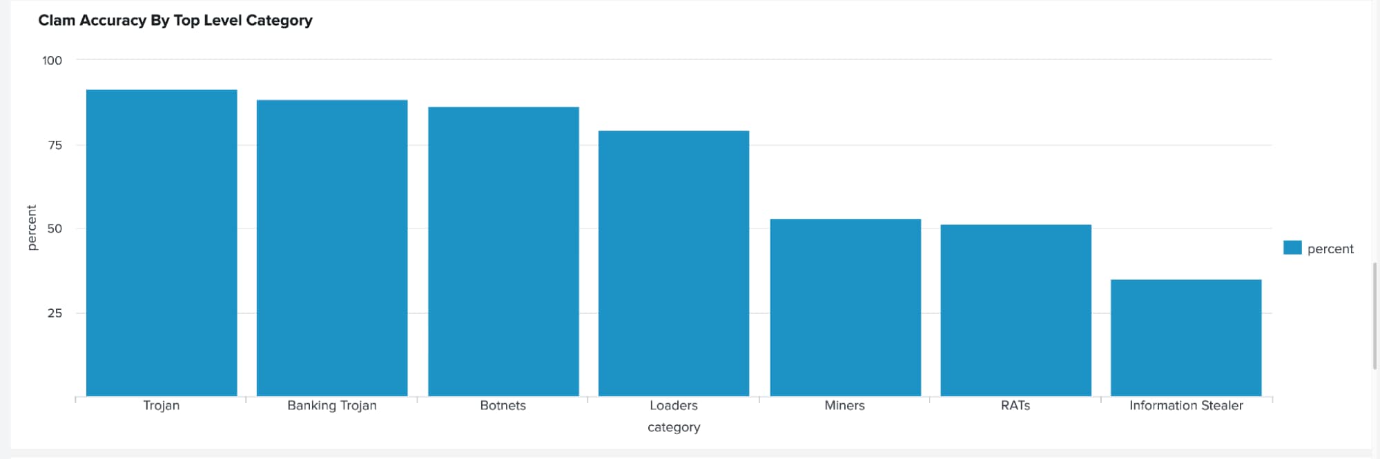 ClamAV does OK for a few top level categories like Trojans & Botnets. However, it does poorly on other malware types like Crypto Miners, RATs and Info Stealers.