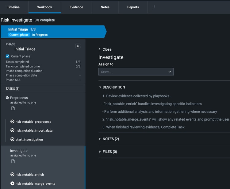 In addition to helping the analyst by gathering key details, the information is presented through a guided case management template called a Workbook. Workbooks are highly customizable and can be adjusted for ad-hoc investigations as well as cloned or built from scratch to suit your organization’s Incident Response plans. In the screenshot below, the Risk Investigation workbook includes the best-practice, recommended steps to handle a Risk Notable from security experts at Splunk. These steps are called “tasks” and are organized into “phases.” Splunk SOAR ships with several templates to choose from. Shown here is the Risk Investigation template and contains one phase called “Initial Triage.”