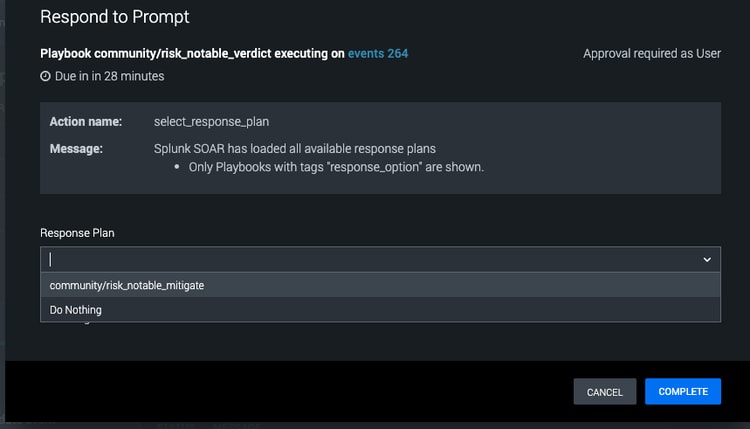 The “render_verdict” prompts the analyst to select a response plan. Response plans are automatically picked up based on what’s available to the system. In the screenshot above, risk_notable_mitigate is selected which will guide the analyst through the mitigation phase of the investigation. Once the analyst clicks “Complete,” Splunk SOAR will add the next workbook called “Risk Response.” Let’s look at how automation works together with the analyst to contain and mitigate affected entities.
