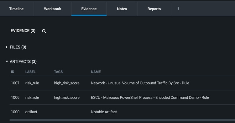 Intelligent case management means that SOAR automatically builds an initial report on the possible compromise, all aligned to the MITRE ATT&CK framework. It will mark important artifacts such as high_risk_score events as evidence as you can see in this screenshot.