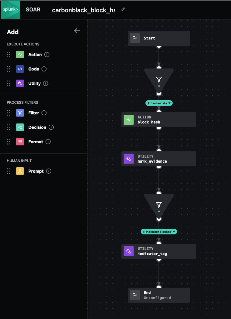 When it comes to taking action on these indicators, Splunk SOAR will ensure that only the right playbooks are paired with the data from your investigation, all based on the connectors you have available. As you import new automation playbooks or develop your own using the Visual Playbook Editor (VPE), they can be registered with the Risk Notable Playbook Pack to be automatically used in all future investigations. This modular and scalable approach ensures that those same playbooks can be reused in situations like Phishing and Malware response. For those automation engineers that want complete control, the VPE supports multiple ways to interact with the data from your event and can be as granular and flexible as you require. Shown here is a sample playbook that leverages VMware Carbon Black to block one of the indicators from the previous screenshot.