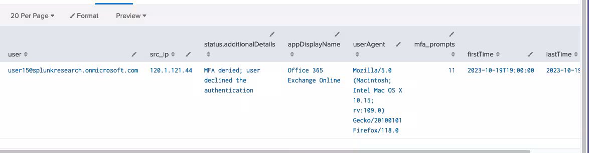| stats count min(_time) as firstTime max(_time) as lastTime by user src_ip, appDisplayName, userAgent
