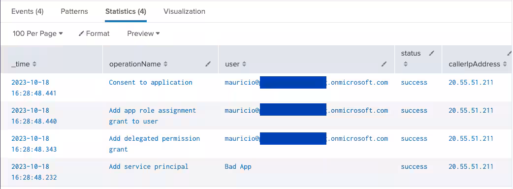 The details provided by the “Consent to application” event enable the creation of targeted detection analytics, focusing on specific scenarios that warrant notification. Furthermore, if the victim grants consent, three additional events are generated: “Add service principal,” “Add delegated permission grant,” and “Add app role assignment grant to user.”