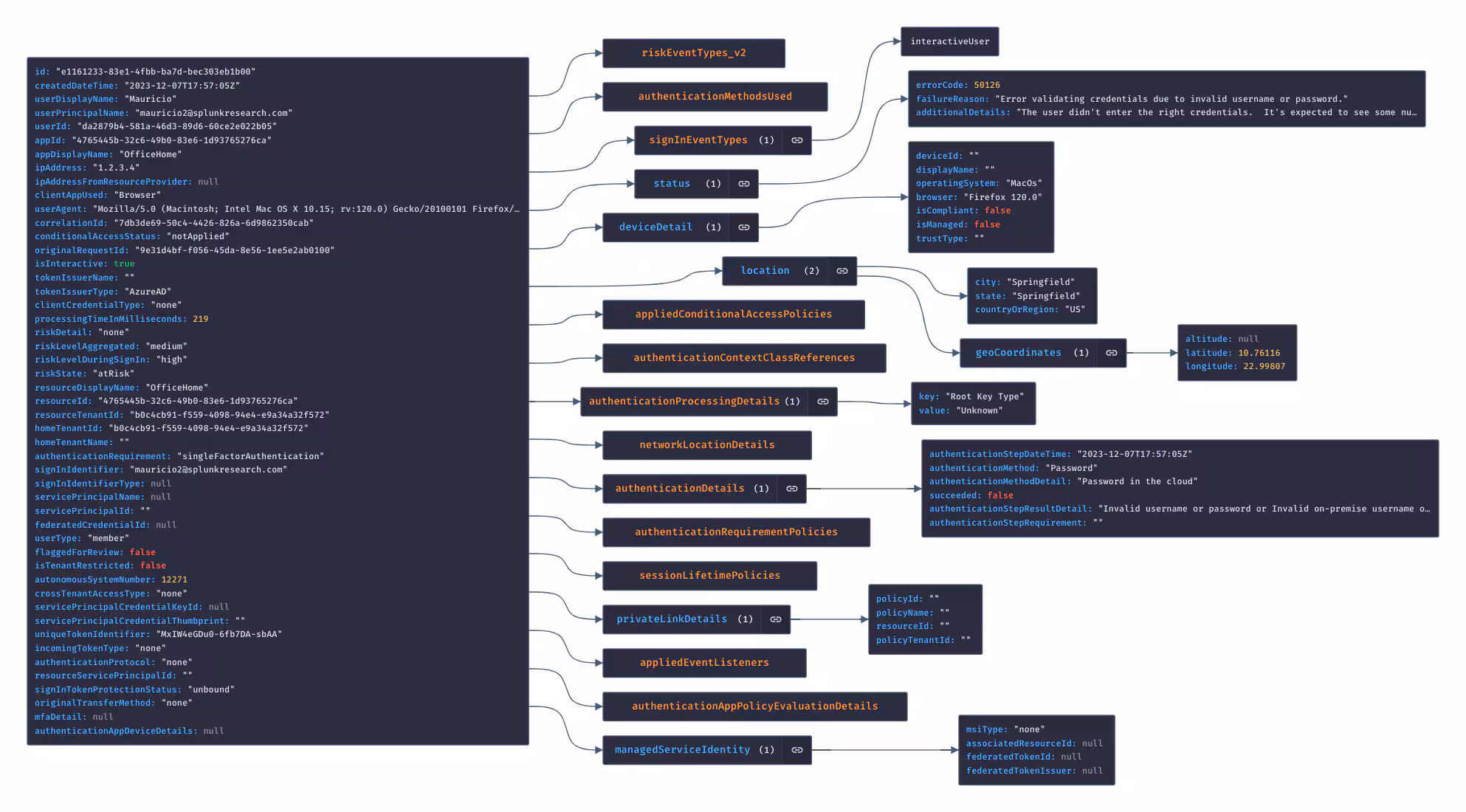 Azure AD authentication events offer a comprehensive dataset that includes user and application information, location, device details, conditional access insights, and details on the authentication method used, indicating whether it involved single or multi-factor authentication (MFA). Additionally, Azure AD logs incorporate risk sign-in information powered by Azure AD Identity Protection, offering even more context.