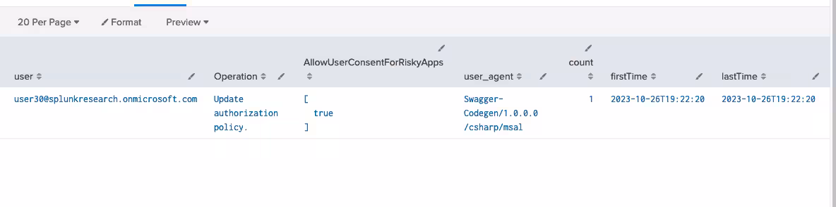 In our simulations, we deliberately disabled the risk-based step-up security control. This action triggers an event under the “Update authorization policy” category. Monitoring for such events can reveal whether a persistent attacker is attempting to weaken security defenses, or if an administrator has inadvertently disabled this control.