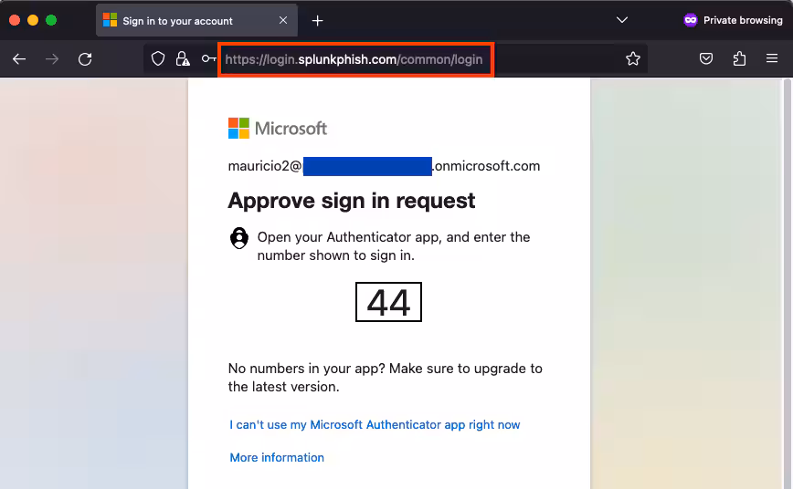 To simulate an AiTM attack, there are a few open source tools available like Modlishka, Muraena and Evilginx. We will leverage Evilginx, a robust and flexible phishing framework. For our testing, we used a public M365 phishlet and the splunkphish.com domain to host the attack.