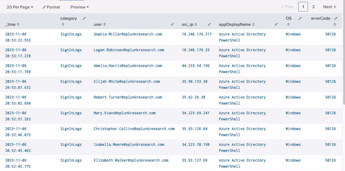 Failed authentication attempts are recorded with the error code 50126, which denotes “Error validating credentials due to invalid username or password.” While the description suggests this error code can also be triggered by submitting an invalid username, our testing has not found that to be the case.