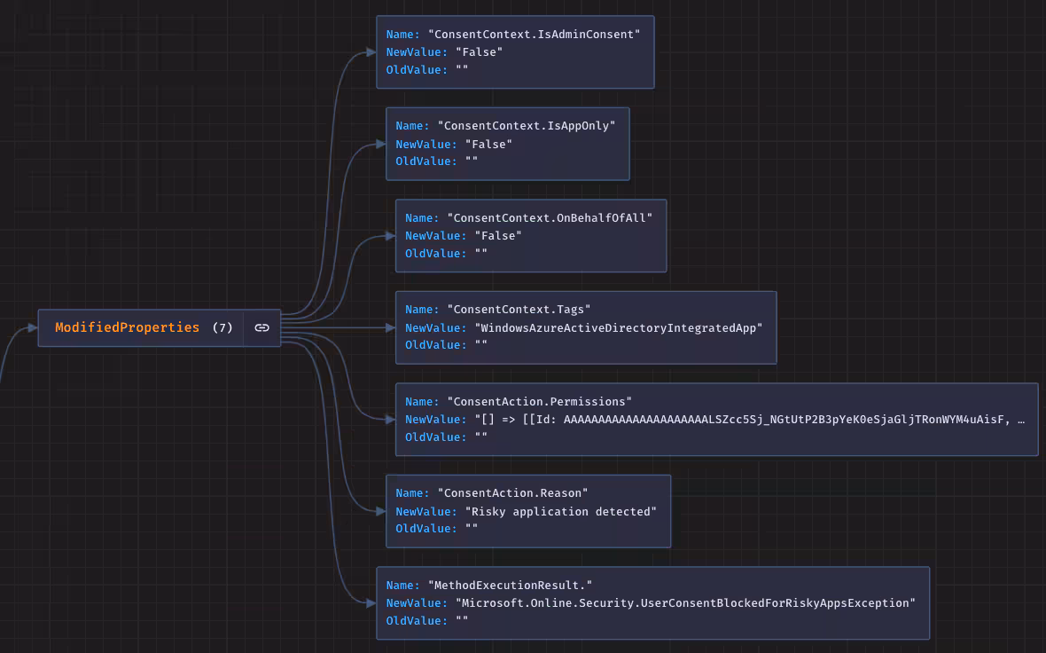 When a user visits a malicious OAuth consent URL and encounters a consent grant prompt, the 'Consent to application' event is triggered. This event provides essential information, such as whether the consent was successful, the identity of the targeted user, the name of the application, and the requested permissions. A notable difference from the UAL is that Azure AD logs include an IP address field. However, this IP address does not represent the victim or the attacker. In our testing, we found that this IP address typically belongs to Microsoft's IP space.